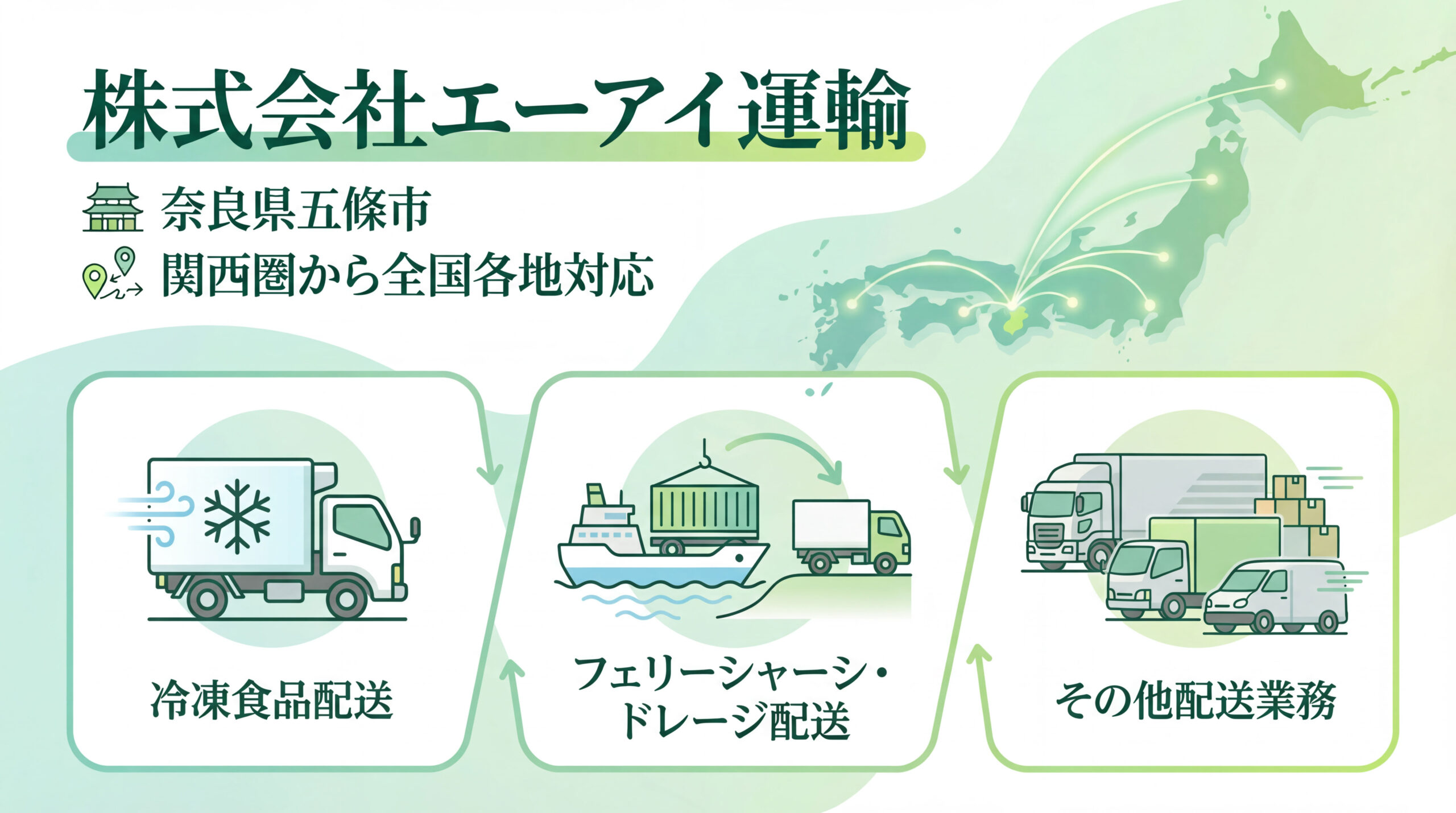 奈良県五條市を拠点とするエーアイ運輸は、関西圏を中心に全国各地まで対応する一般貨物自動車運送業の会社です。冷凍食品配送をはじめ、フェリーを利用したシャーシ配送・ドレージ輸送、その他各種配送業務まで、幅広い物流ニーズにお応えしています。物流において欠かせない時間厳守・安全管理・丁寧な対応を徹底し、当たり前のことを当たり前に積み重ねることで、取引先からの信頼を築いてきました。スピードと正確さを両立した輸送体制と、真面目で責任感のあるスタッフが、大切な荷物を確実にお届けします。関西圏を拠点とした地域密着の対応力と、全国規模の輸送ネットワークを活かし、お客様の物流パートナーとして安心・安定した配送サービスを提供しています。